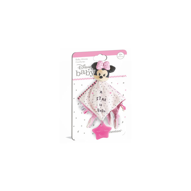 La dolcissima Baby Minnie è una copertina comforter che diventerà il compagno di giochi del bambino accompagnandolo anche nel momento della nanna. Realizzato in soffice tessuto atossico, questo peluche transizionale è pensato per assorbire gli odori, in modo da rassicurare il bambino nel momento del distacco dal genitore. Il ciondolo in plastica stimola la percezione tattile del bambino ed è adatto alla fase di dentizione.