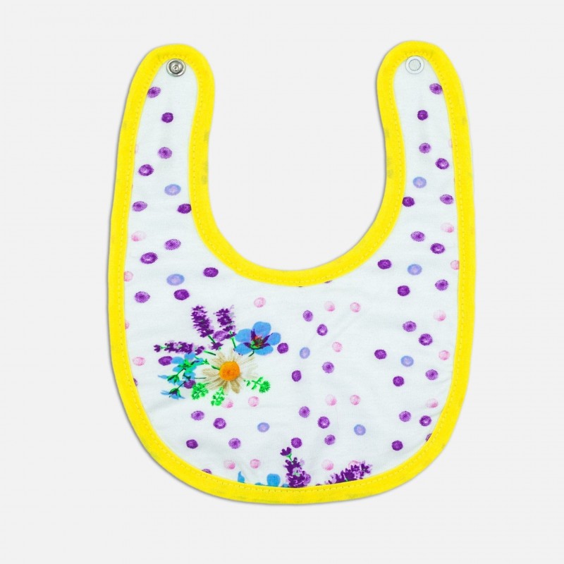 Bavetta della collezione Primavera/Estate firmata Luglio in morbido cotone bianco con bordi a contrasto in giallo e simpatiche fantasie floreali.