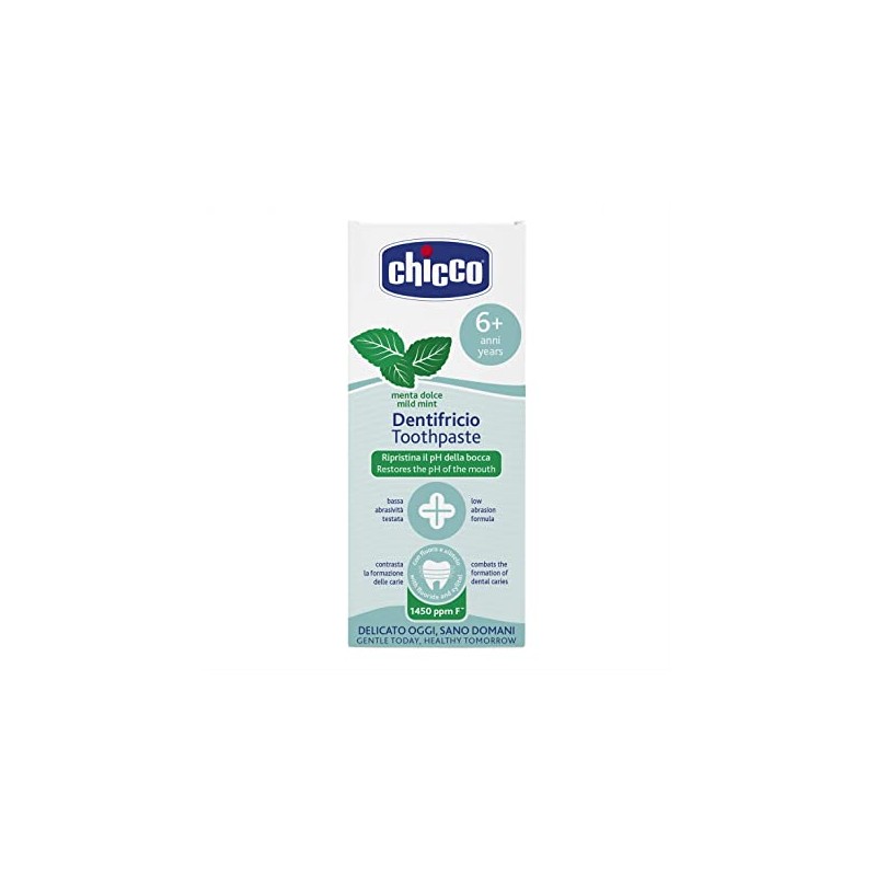 Il dentifricio Chicco alla menta dolce è studiato per la corretta igiene orale dei bimbi dai 6 anni in su.