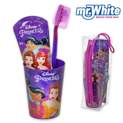 Un pratico set completo di: spazzolino da denti con ventosa alla base, tappo per spazzolino, dentifricio per bambini con delicato sapone alla menta da 75ml e bicchiere.