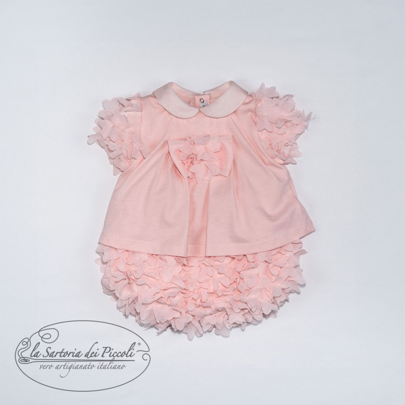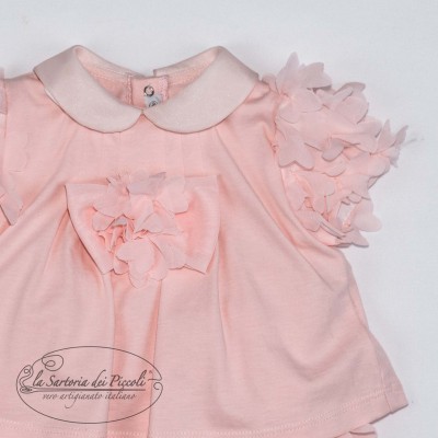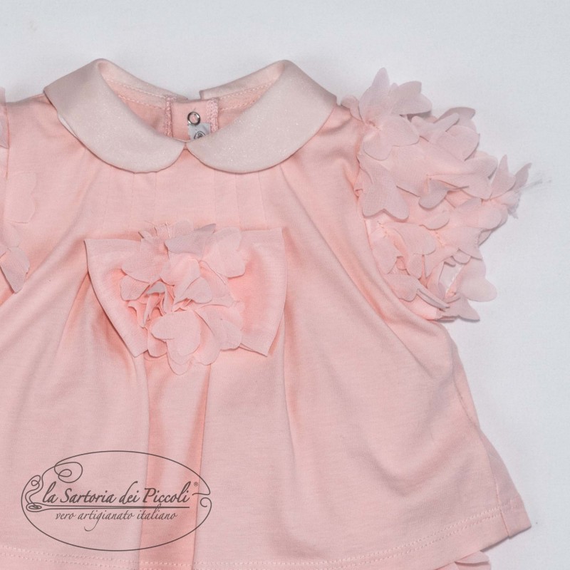 Pagliaccetto in cotone rosa con dettagli floreali in rilievo, colletto raffinato e maniche corte.